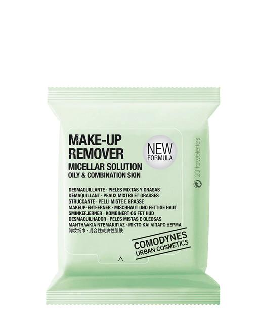Las toallitas Comodynes make-up remover micellar solution están diseñadas para sustituir leche, tónico y desmaquillador de ojos. Eliminan impurezas y maquillaje, dejando la piel suave, limpia, tonificada e hidratada. Presentadas en un paquete de 20 toallitas, contienen activos principales como tensioactivos suaves, betaina, derivado de la glucosa, extracto de té verde y agua de hammamelis.