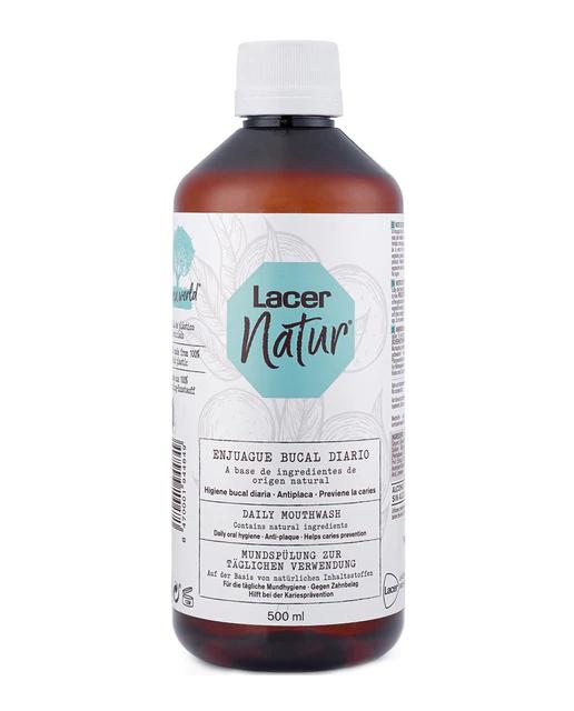 Enjuague bucal diario a base de ingredientes de origen natural y packaging ecosostenible. Antiplaca y previene la caries. Botella 100% plástico reciclado. Idóneo como complemento después del cepillado dental. Lacer Natur, con extractos naturales vegetales, previene la placa dental y ayuda a mantener una boca y unos dientes sanos. Protege contra la caries.