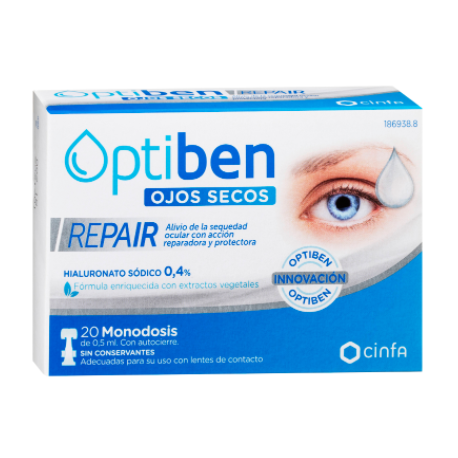 Optiben Ojos Secos Repair, gracias a su formulación en forma de aguas destiladas, posee una acción reparadora y protectora de la superficie ocular. Está indicado para refrescar y lubricar los ojos con sensación de quemazón, irritación y molestias provocadas por la sequedad.