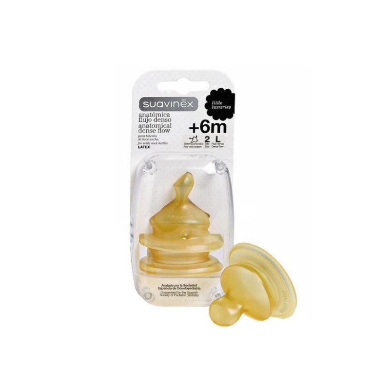 La Suavinex Tetina de Látex Anatómica Talla 2 está diseñada para imitar la forma del pezón materno durante la succión, gracias a su diseño avalado por la Sociedad Española de Odontopediatría (SEOP). Las válvulas en su base previenen molestias como el hipo y los cólicos gaseosos, que pueden surgir de la ingesta de aire. Esta talla 2 es ideal para bebés de más de 6 meses, con un flujo denso (L) que resulta perfecto para papillas y otros alimentos consistentes; además, es adecuada para bebés con un apetito voraz. Se recomienda especialmente para los biberones de boca ancha de Suavinex.
